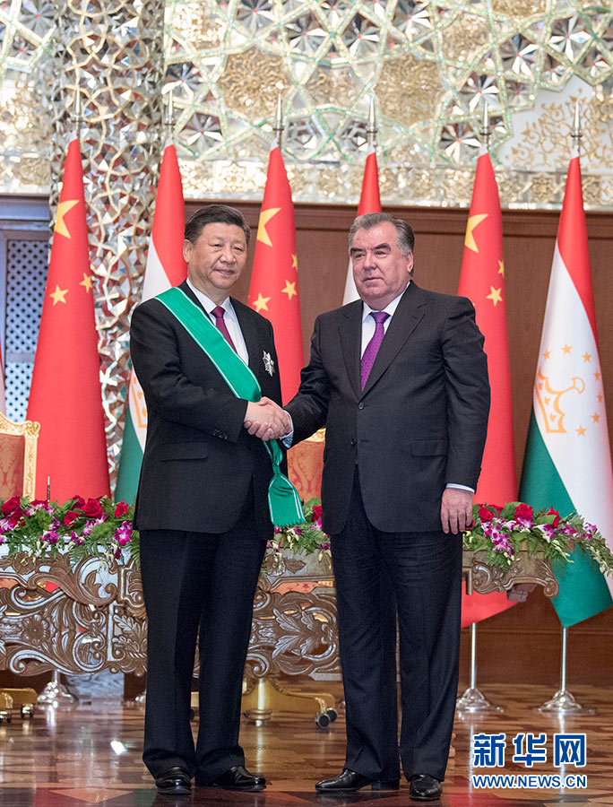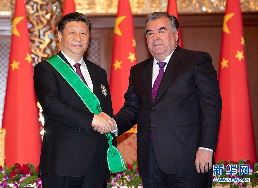6月15日,國家主席習(xí)近平在杜尚別出席儀式,接受塔吉克斯坦總統(tǒng)拉赫蒙授予“王冠勛章”。 新華社記者 沙達(dá)提 攝