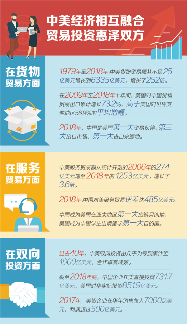 在國(guó)際經(jīng)濟(jì)合作中,正常的貿(mào)易關(guān)系是建立在等價(jià)交換基礎(chǔ)上的互惠互利關(guān)系,而不是你多我少、你輸我贏的“零和博弈”。國(guó)際貿(mào)易有利于推動(dòng)資源在世界范圍內(nèi)優(yōu)化配置,促進(jìn)各國(guó)經(jīng)濟(jì)共同發(fā)展,推動(dòng)人類社會(huì)共同進(jìn)步,國(guó)際貿(mào)易的歷史早已證明這樣的實(shí)踐是有效的,實(shí)踐經(jīng)驗(yàn)也早已成為國(guó)際經(jīng)濟(jì)學(xué)的基本原理,中美經(jīng)貿(mào)合作的事實(shí)也作了同樣的驗(yàn)證。中美建交以來(lái),在雙邊貿(mào)易方面,1979年至2018年,雙邊貨物貿(mào)易額從不足25億美元增長(zhǎng)到6335億美元,增長(zhǎng)了252倍;在雙向投資領(lǐng)域,過(guò)去40年,中美雙向投資由幾乎為零到累計(jì)近1600億美元,中美互為對(duì)方重要投資伙伴,投資的雙向性和互惠性進(jìn)一步顯現(xiàn)。中美經(jīng)貿(mào)關(guān)系發(fā)展的歷程證明,中美通過(guò)優(yōu)勢(shì)互補(bǔ)、互通有無(wú),有力促進(jìn)了各自經(jīng)濟(jì)發(fā)展和產(chǎn)業(yè)結(jié)構(gòu)優(yōu)化升級(jí),雙方經(jīng)貿(mào)往來(lái)是惠澤彼此的關(guān)系,而非中國(guó)讓美國(guó)“吃虧”的過(guò)程。