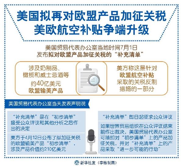 新華社華盛頓7月1日電(記者熊茂伶 鄧仙來)美國貿(mào)易代表辦公室1日發(fā)布擬對歐盟產(chǎn)品加征關(guān)稅的“補(bǔ)充清單”,涉及奶制品、橄欖和威士忌酒等約40億美元?dú)W盟輸美產(chǎn)品。美方稱這是針對歐盟航空補(bǔ)貼采取的關(guān)稅反制措施的一部分。