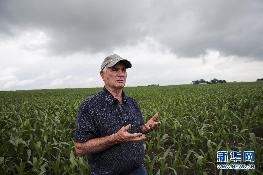 6月18日,在美國艾奧瓦州大西洋鎮(zhèn),農場主比爾·佩雷特在自家的玉米地里接受采訪。?新華社記者 王迎 攝