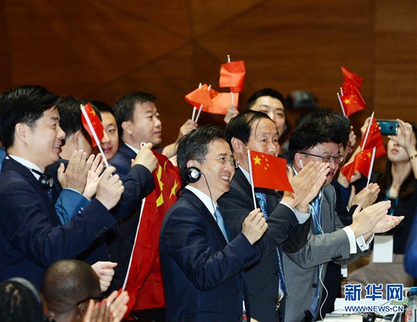 7月6日,在阿塞拜疆巴庫,中國代表團在世界遺產(chǎn)大會上慶祝中國良渚古城遺址申遺成功。中國良渚古城遺址6日在阿塞拜疆巴庫舉行的世界遺產(chǎn)大會上獲準列入世界遺產(chǎn)名錄。至此,中國世界遺產(chǎn)總數(shù)已達55處,位居世界第一。新華社發(fā)(巴巴耶夫 攝)