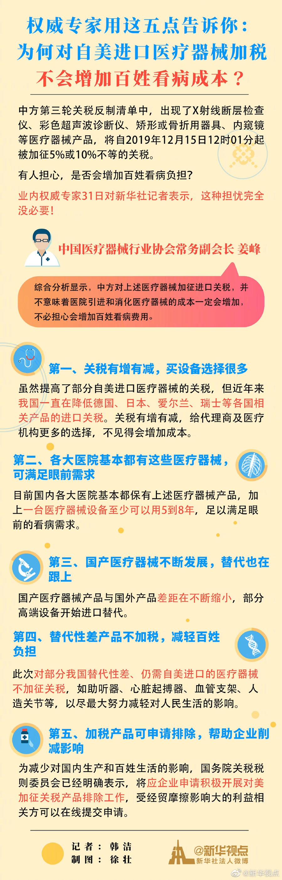 對此,中國醫(yī)療器械行業(yè)協(xié)會常務(wù)副會長姜峰31日接受記者采訪時說,綜合分析顯示,中方對上述醫(yī)療器械加征進(jìn)口關(guān)稅,并不意味著醫(yī)院引進(jìn)和消化醫(yī)療器械的成本一定會增加,不必?fù)?dān)心會增加百姓看病費(fèi)用。