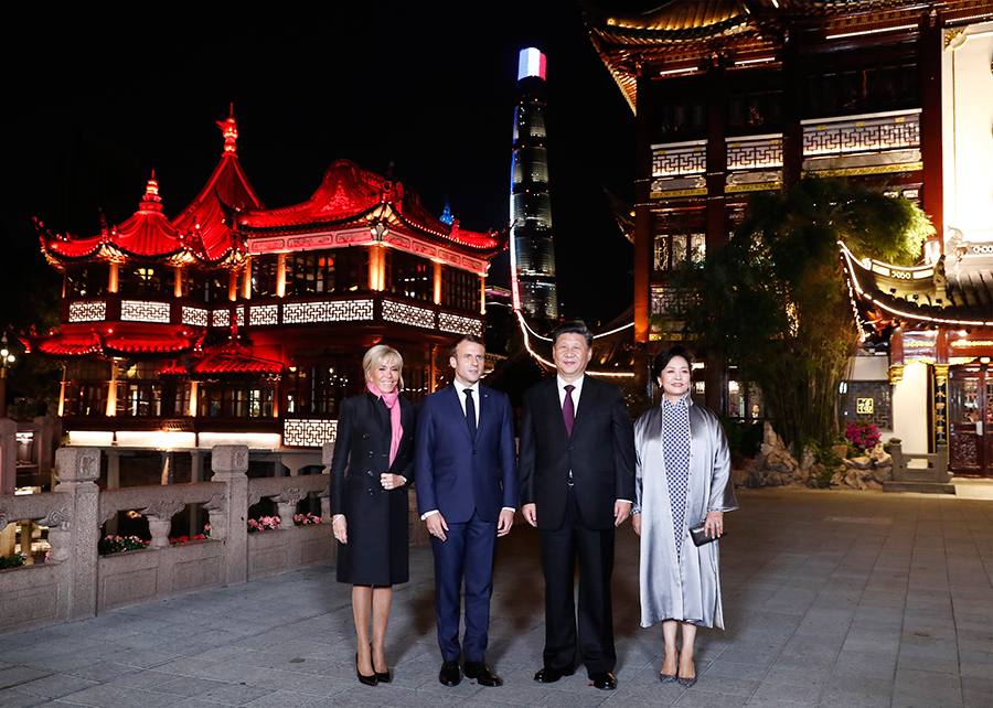 在前往北京前,5日晚,習(xí)近平主席和夫人彭麗媛在上??畲笋R克龍總統(tǒng)和夫人布麗吉特。地點是著名的江南古典園林——豫園。
