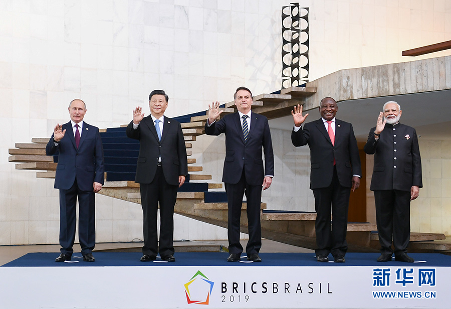 當(dāng)?shù)貢r(shí)間11月14日,金磚國家領(lǐng)導(dǎo)人第十一次會(huì)晤在巴西首都巴西利亞舉行。巴西總統(tǒng)博索納羅主持會(huì)晤。中國國家主席習(xí)近平、俄羅斯總統(tǒng)普京、印度總理莫迪、南非總統(tǒng)拉馬福薩出席。這是五國領(lǐng)導(dǎo)人合影。 新華社記者 謝環(huán)馳 攝