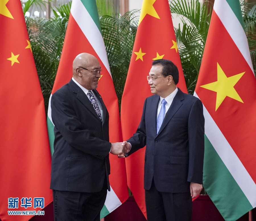 11月27日,國務(wù)院總理李克強(qiáng)在北京人民大會(huì)堂會(huì)見來華進(jìn)行國事訪問的蘇里南總統(tǒng)鮑特瑟。 新華社記者 李學(xué)仁 攝