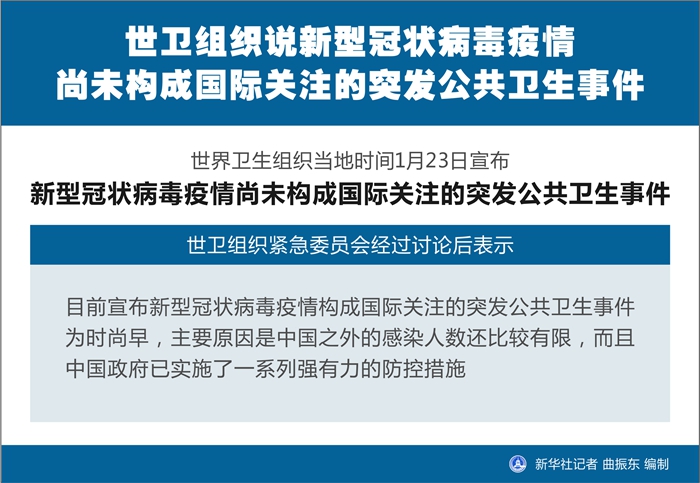 新華社日內(nèi)瓦1月23日電(記者劉曲 任珂)世界衛(wèi)生組織23日宣布,新型冠狀病毒疫情尚未構(gòu)成國際關(guān)注的突發(fā)公共衛(wèi)生事件。