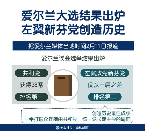 新華社都柏林2月11日電(記者張琪)據(jù)愛爾蘭媒體11日報道,愛爾蘭議會選舉結(jié)果出爐:共和黨獲得38席,排名第一;左翼政黨新芬黨僅以一席之差排名第二,創(chuàng)造歷史最佳成績,一舉打破眾議院由共和黨、統(tǒng)一黨長期主導(dǎo)的局面。