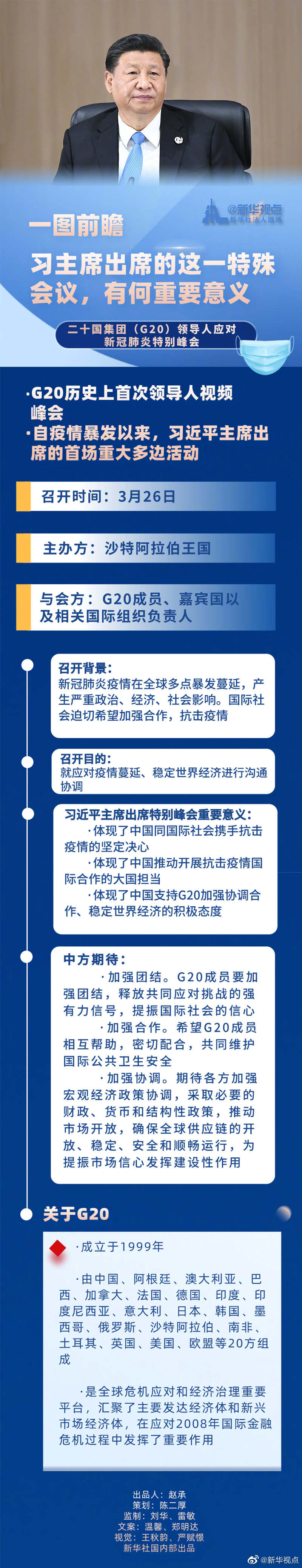 國家主席習(xí)近平將于3月26日出席二十國集團(tuán)領(lǐng)導(dǎo)人應(yīng)對新冠肺炎特別峰會(huì),此次峰會(huì)將以視頻的方式舉行。習(xí)近平主席出席此次特別峰會(huì)有什么重要意義?