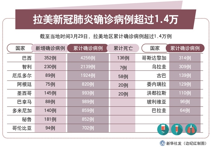 新華社巴西利亞3月29日電 綜合新華社駐拉美地區(qū)記者報道:拉美地區(qū)新冠肺炎疫情持續(xù)加劇。截至29日,拉美地區(qū)累計確診病例超過1.4萬例,其中巴西和智利分別超過4000例和2000例。玻利維亞當日報告首例死亡病例。