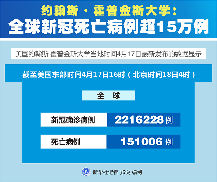 新華社紐約4月17日電 美國(guó)約翰斯·霍普金斯大學(xué)17日最新發(fā)布的數(shù)據(jù)顯示,截至美國(guó)東部時(shí)間17日16時(shí)(北京時(shí)間18日4時(shí)),全球新冠死亡病例超過(guò)15萬(wàn)例,達(dá)到151006例,全球確診病例達(dá)2216228例。