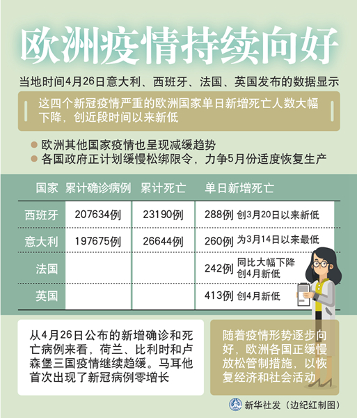 新華社里斯本4月26日電 綜合新華社駐歐洲地區(qū)記者報道:意大利、西班牙、法國、英國26日發(fā)布的數(shù)據(jù)顯示,這四個新冠疫情嚴重的歐洲國家單日新增死亡人數(shù)大幅下降,創(chuàng)近段時間以來新低。歐洲其他國家疫情也呈現(xiàn)減緩趨勢。各國政府正計劃緩慢松綁限令,力爭5月份適度恢復生產。