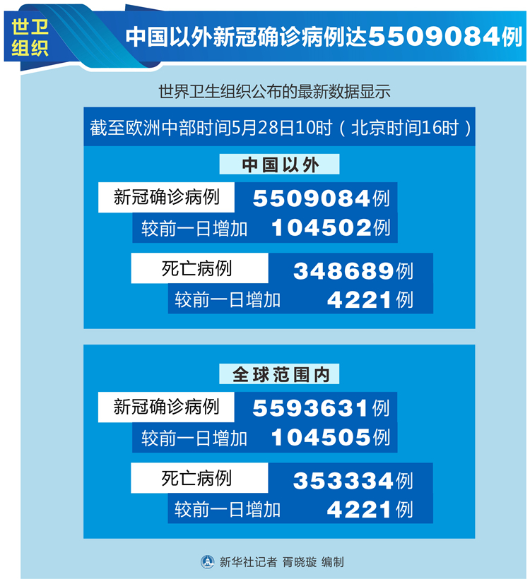 世衛(wèi)組織每日疫情報(bào)告顯示,截至歐洲中部時(shí)間28日10時(shí)(北京時(shí)間16時(shí)),中國(guó)以外新冠確診病例較前一日增加104502例,達(dá)到5509084例;中國(guó)以外死亡病例較前一日增加4221例,達(dá)到348689例。