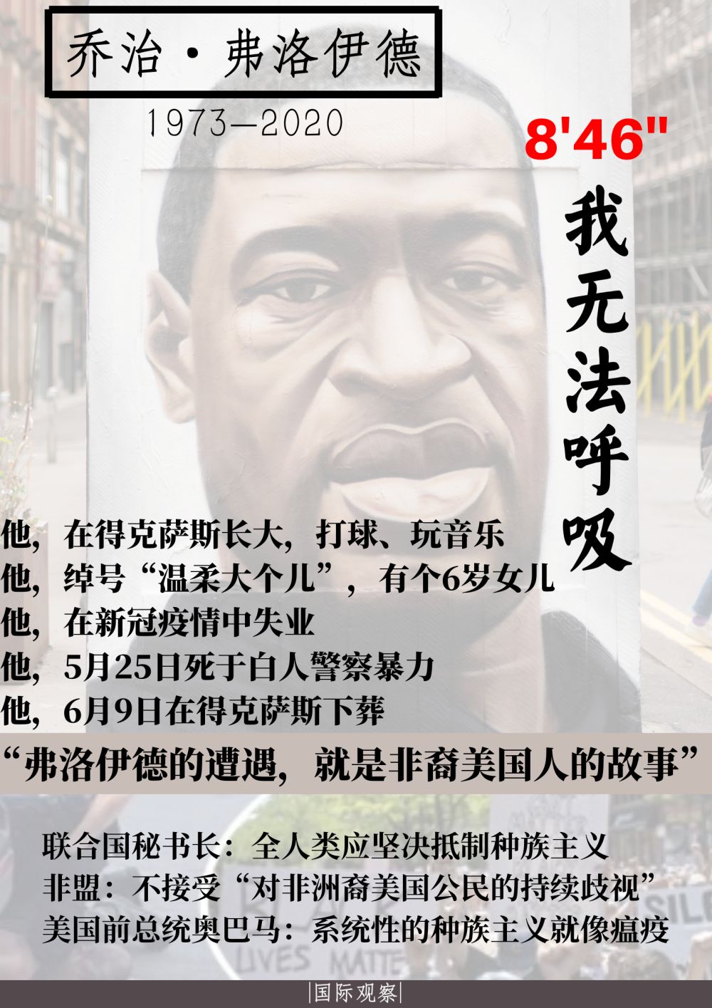 他死前“我無法呼吸”的懇求,在大選年和新冠疫情中,把美國帶入“痛苦時(shí)刻”,將長久地載入美國當(dāng)代史。