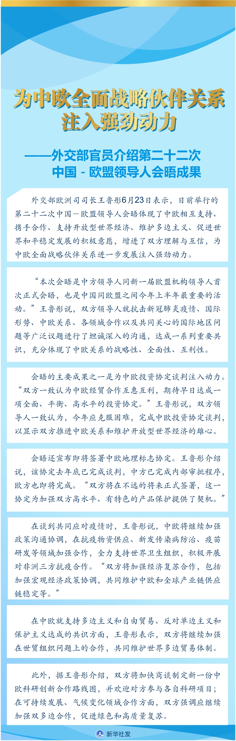 新華社北京6月23日電(記者王賓)外交部歐洲司司長(zhǎng)王魯彤23日表示,日前舉行的第二十二次中國(guó)-歐盟領(lǐng)導(dǎo)人會(huì)晤體現(xiàn)了中歐相互支持、攜手合作、支持開(kāi)放型世界經(jīng)濟(jì)、維護(hù)多邊主義、促進(jìn)世界和平穩(wěn)定發(fā)展的積極意愿,增進(jìn)了雙方理解與互信,為中歐全面戰(zhàn)略伙伴關(guān)系進(jìn)一步發(fā)展注入強(qiáng)勁動(dòng)力。