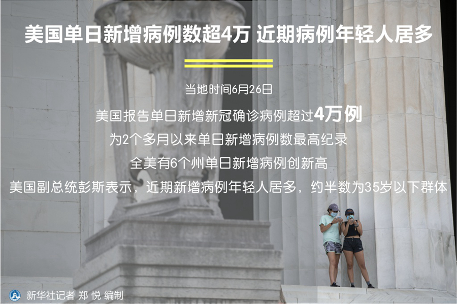 新華社華盛頓6月26日電(記者譚晶晶)美國26日報告單日新增新冠確診病例超過4萬例,為2個多月以來單日新增病例數(shù)最高紀(jì)錄。全美有6個州單日新增病例創(chuàng)新高。美國副總統(tǒng)彭斯表示,近期新增病例年輕人居多,約半數(shù)為35歲以下群體。