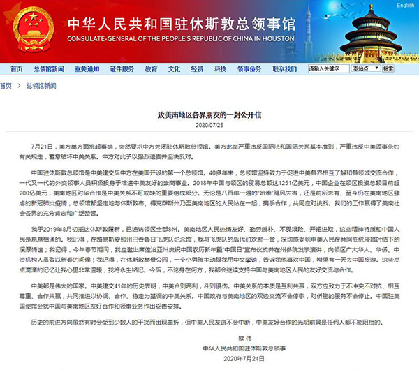 7月21日,美方單方面挑起事端,突然要求中方關(guān)閉駐休斯敦總領(lǐng)館。美方此舉嚴重違反國際法和國際關(guān)系基本準則,嚴重違反中美領(lǐng)事條約有關(guān)規(guī)定,蓄意破壞中美關(guān)系。中方對此予以強烈譴責(zé)并堅決反對。