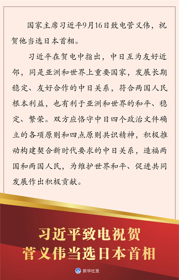 新華社北京9月16日電 國(guó)家主席習(xí)近平今天致電菅義偉,祝賀他當(dāng)選日本首相。