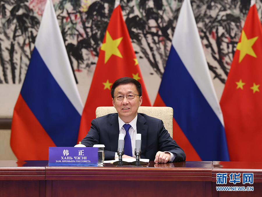 11月24日,中共中央政治局常委、國務(wù)院副總理、中俄能源合作委員會中方主席韓正在北京與俄羅斯副總理、委員會俄方主席諾瓦克通過視頻方式共同主持中俄能源合作委員會第十七次會議。新華社記者 王曄 攝