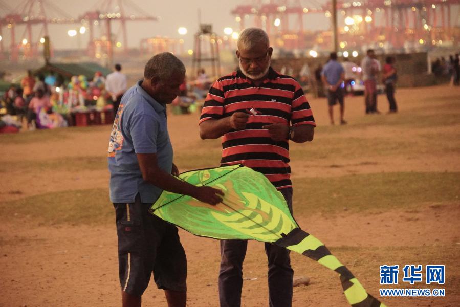 這張拍攝于2019年1月10日的資料照片顯示,納瓦在斯里蘭卡首都科倫坡加勒菲斯綠地廣場上調(diào)整風箏。新華社記者 唐璐 攝