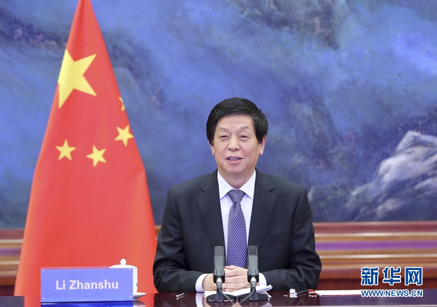 12月15日,全國(guó)人大常委會(huì)委員長(zhǎng)栗戰(zhàn)書在北京人民大會(huì)堂以視頻方式同日本眾議長(zhǎng)大島理森舉行會(huì)談。新華社記者 丁海濤 攝