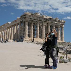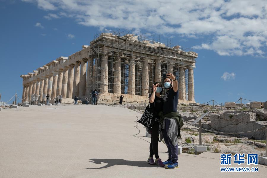 3月22日,游客在希臘雅典衛(wèi)城自拍。希臘露天考古遺跡22日起恢復(fù)開放。游客需遵守保持社交距離和佩戴口罩等防疫規(guī)定。新華社發(fā)(萊夫特里斯·帕察里斯攝)