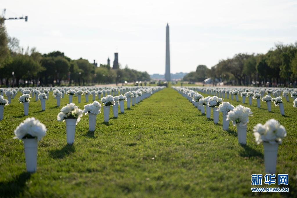 這是4月13日拍攝的美國(guó)華盛頓國(guó)家廣場(chǎng)草坪上擺放的白色絹花。