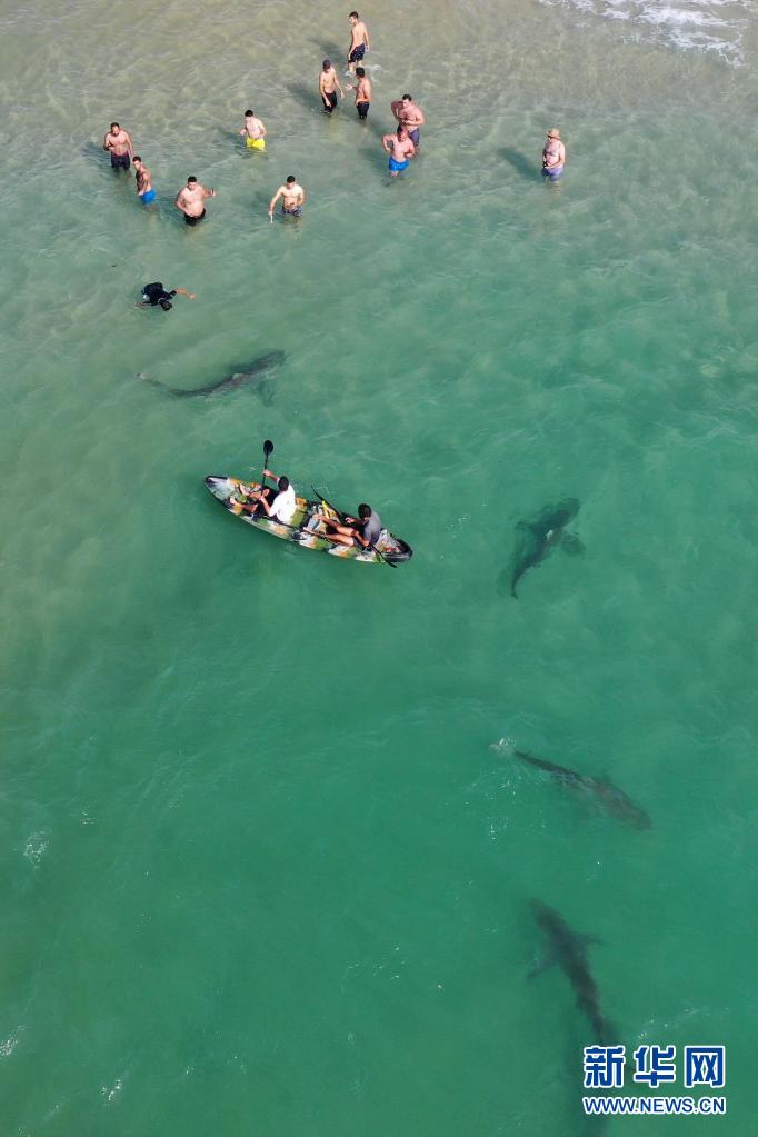4月20日,在以色列北部城市哈代拉的海邊,鯊魚從人們身邊游過(guò)(無(wú)人機(jī)照片)。