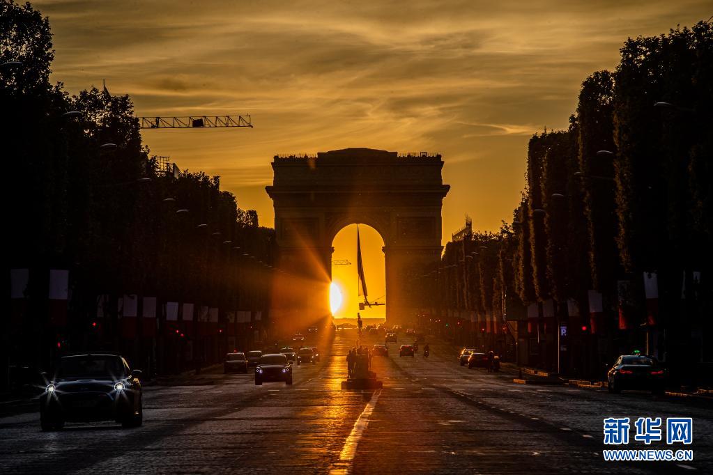 這是5月8日在法國(guó)巴黎香榭麗舍大街拍攝的凱旋門落日景象。