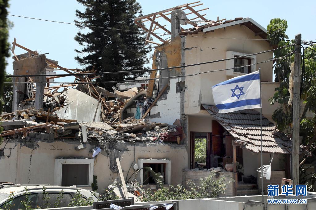 這是5月13日在以色列中部城市耶胡德拍攝的被火箭彈擊中損毀的房屋。