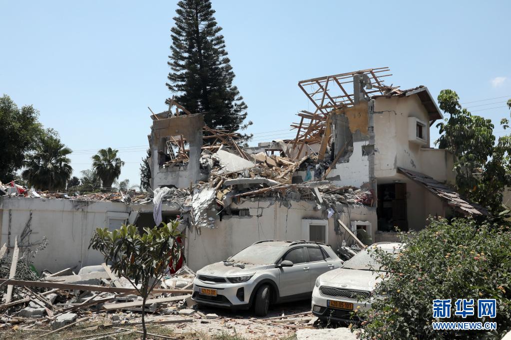 這是5月13日在以色列中部城市耶胡德拍攝的被火箭彈擊中損毀的房屋。