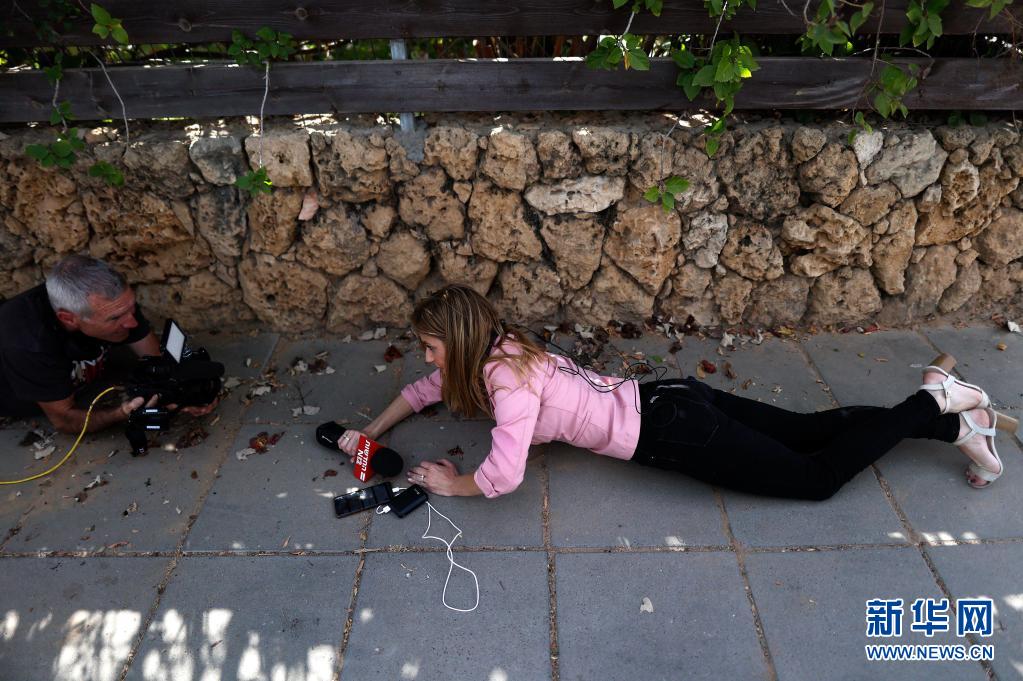 5月20日,人們在以色列南部城市阿什凱隆接到火箭彈襲擊警報(bào)后就地躲避。