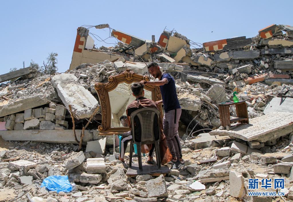 5月26日,在加沙地帶北部的城鎮(zhèn)貝特拉希亞,23歲的巴勒斯坦理發(fā)師阿卜杜拉·扎瓦拉在他被以色列炸毀的房屋前為顧客免費(fèi)服務(wù)?!⌒氯A社發(fā)(里澤克·阿卜杜勒·賈瓦德攝)