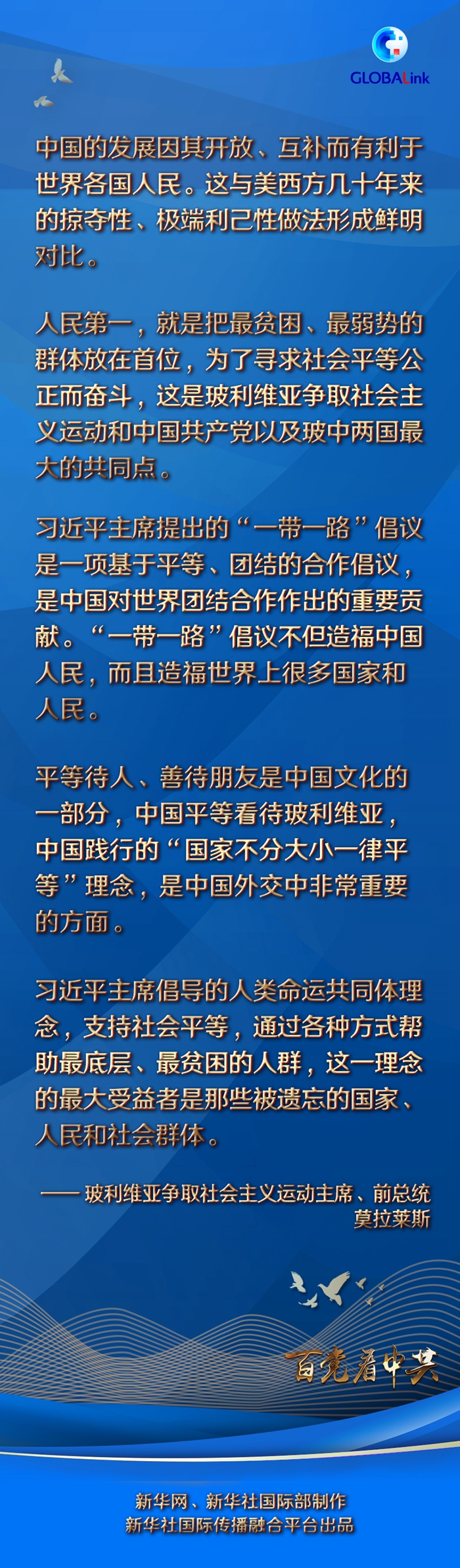 莫拉萊斯指出,習近平主席倡導的人類命運共同體理念,支持社會平等,通過各種方式幫助最底層、最貧困的人群,這一理念的最大受益者是那些被遺忘的國家、人民和社會群體。